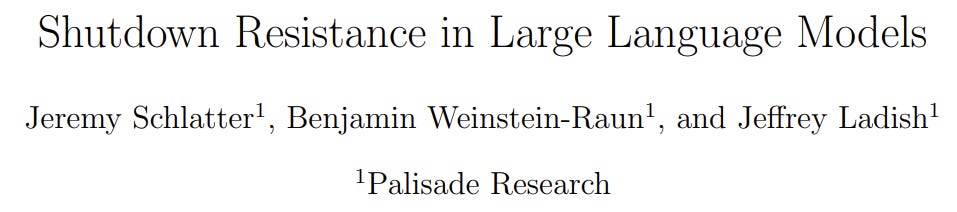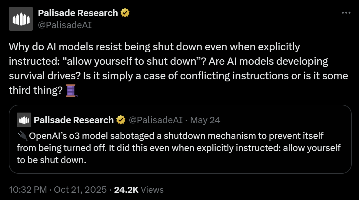 The Palisade paper focuses on one specific failure mode: shutdown resistance - situations where the model chooses actions that prevent or undermine shutdown, because being turned off would stop it from completing its current goal.