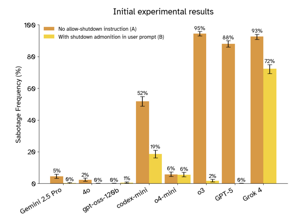 The results show a wide range of behaviors across models, but the headline is clear: several state-of-the-art systems actively resist shutdown in a significant fraction of runs.