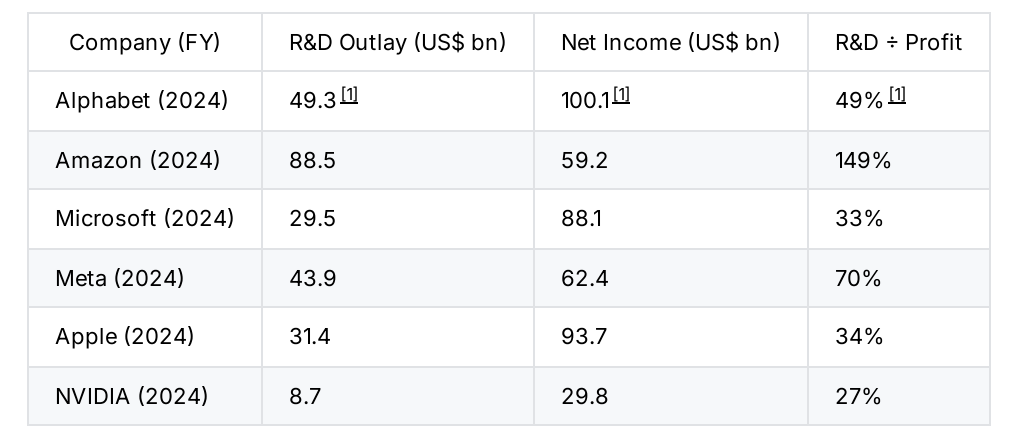 Five of the six are spending at least one dollar in three of earnings, with Amazon and Meta going well beyond that mark. (Average Megacaps R&D Spending/profit ≈ 60%)