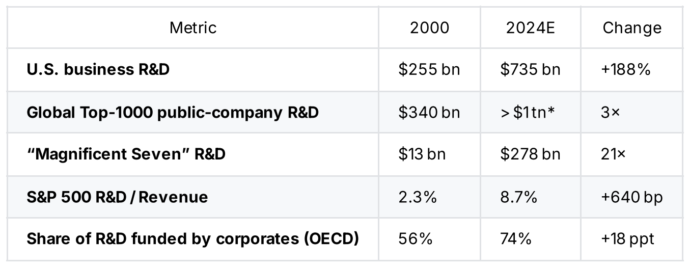 In particular, Six US mega‑caps alone—Apple, Microsoft, Alphabet, Amazon, Meta and Nvidia—now invest ≈ $250 billion per year in research, roughly equal to the entire U.S. private‑sector R&D bill at the peak of the 2000 dot‑com boom. The key takeaway here is that the centre of gravity for advanced research has shifted from government labs to the corporate P&L, with an unprecedented concentration in a handful of tech titans.
