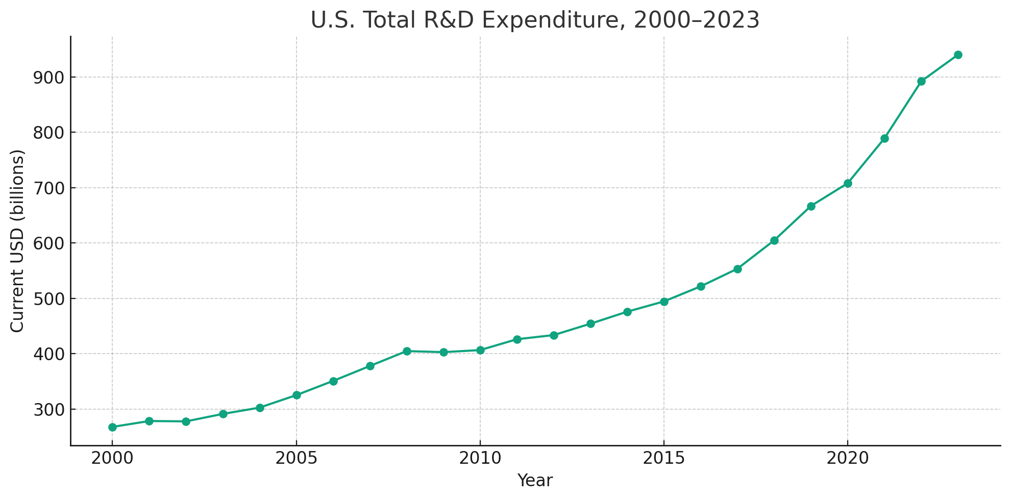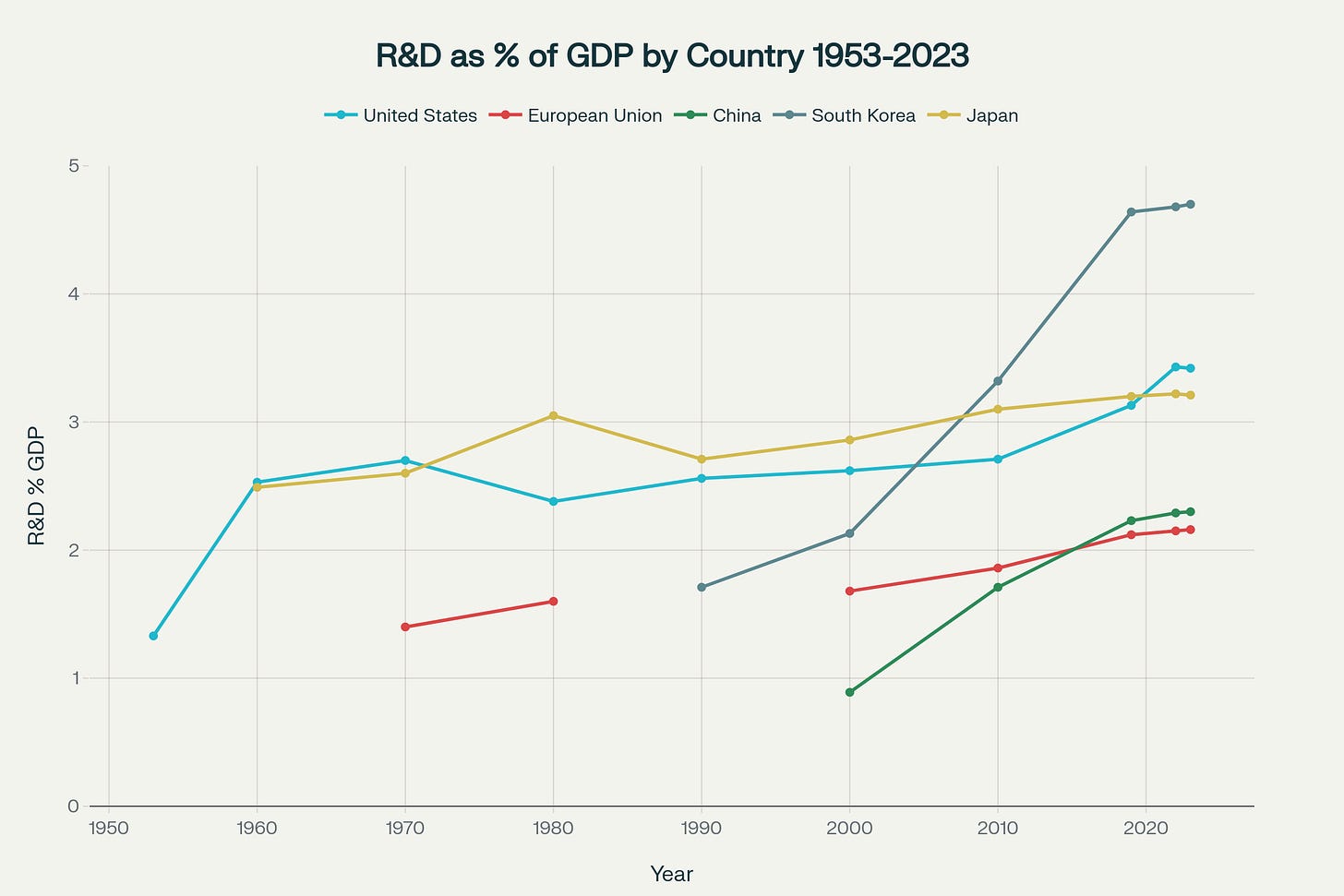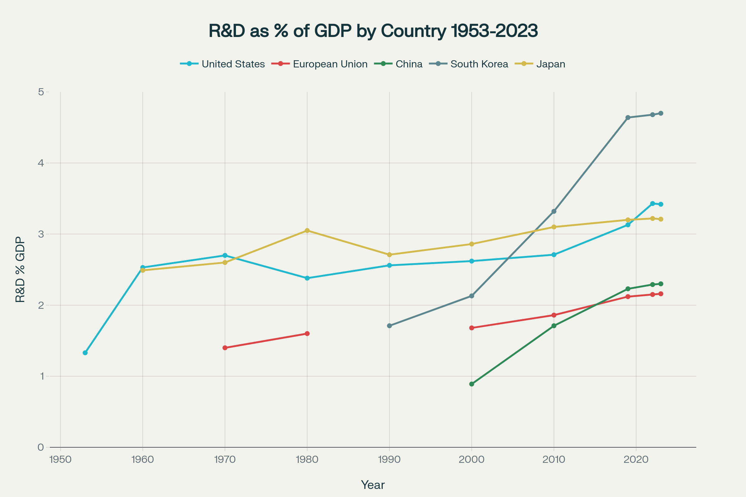 To put this in a global context, over the past several decades, major economies have steadily increased their R&D spending relative to GDP, with the United States reaching over 3% and South Korea emerging as the global leader by exceeding 4.5%. While Japan and the European Union have maintained strong and stable investment near or above 2–3%, China’s rapid rise since the early 2000s reflects its substantial commitment to technological advancement.
