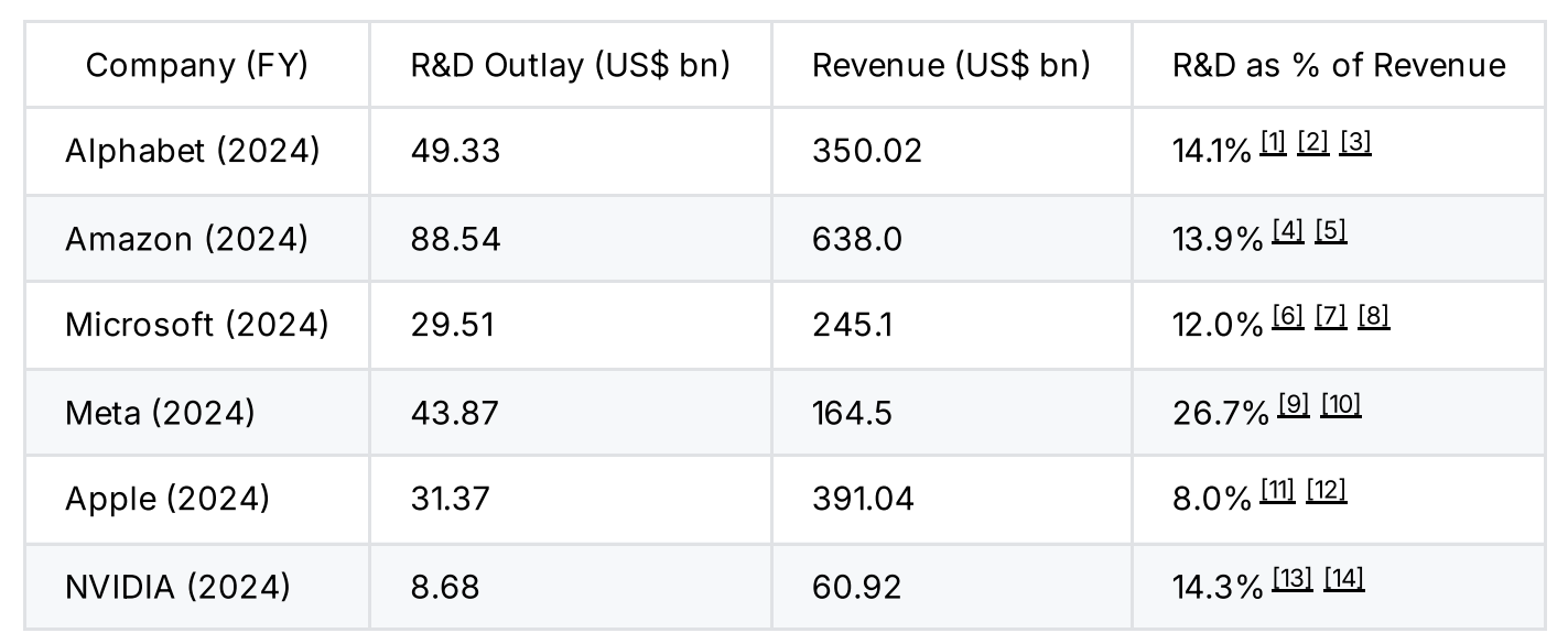 The six giants devoted roughly $252 billion to R&D last year, about 15¢ of every revenue dollar they generated, underscoring the scale of the AI arms race now under way. (Average Megacaps R&D Spending/revenue ≈ 15%)